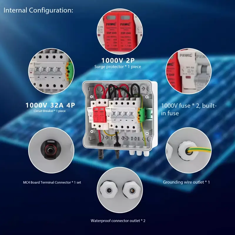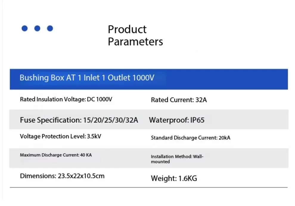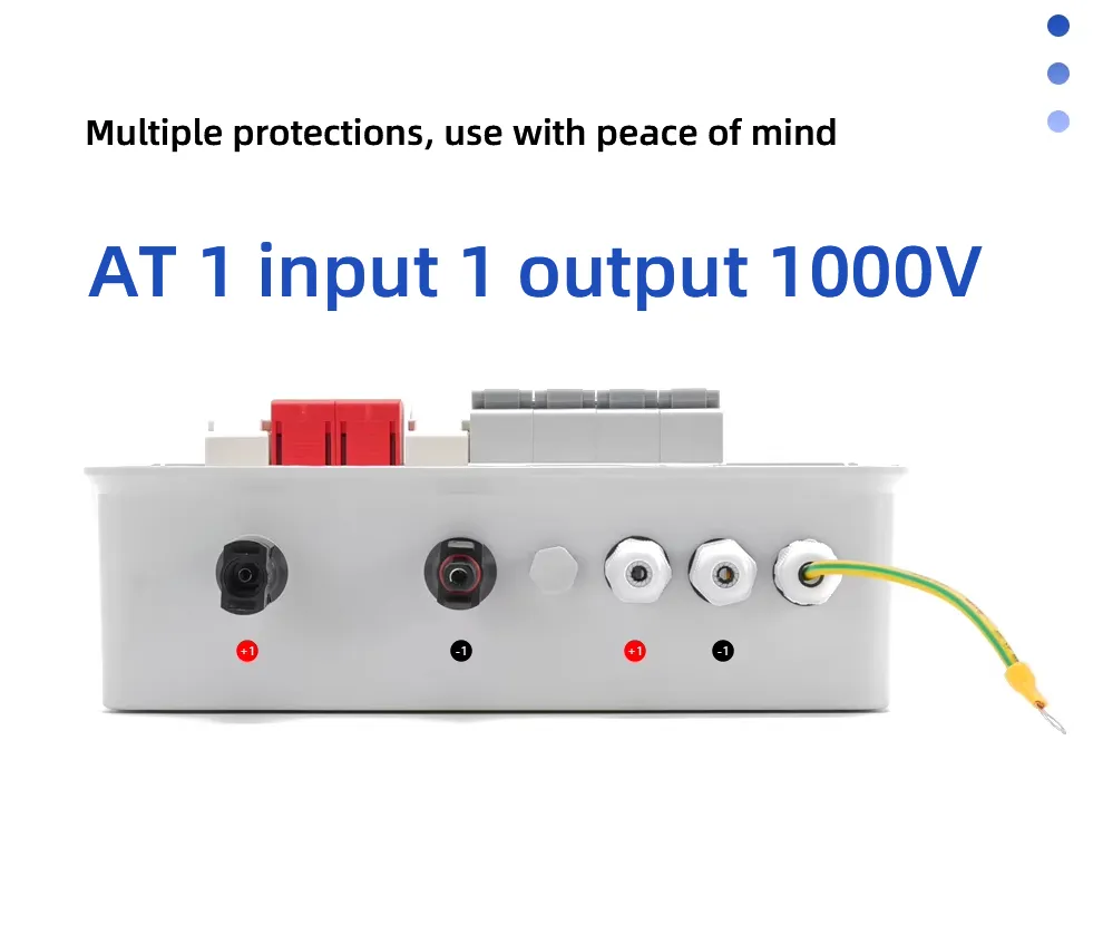 Our AT 1000V 1-In-1-Out PV Combiner Box is engineered for reliable outdoor solar system performance, featuring IP65 waterproof protection and a built-in surge protection device to safeguard your photovoltaic investments. Designed for easy installation and low maintenance, this combiner box ensures safe current distribution and circuit protection, making it an essential and suitable component for both residential and small-scale commercial photovoltaic setups.