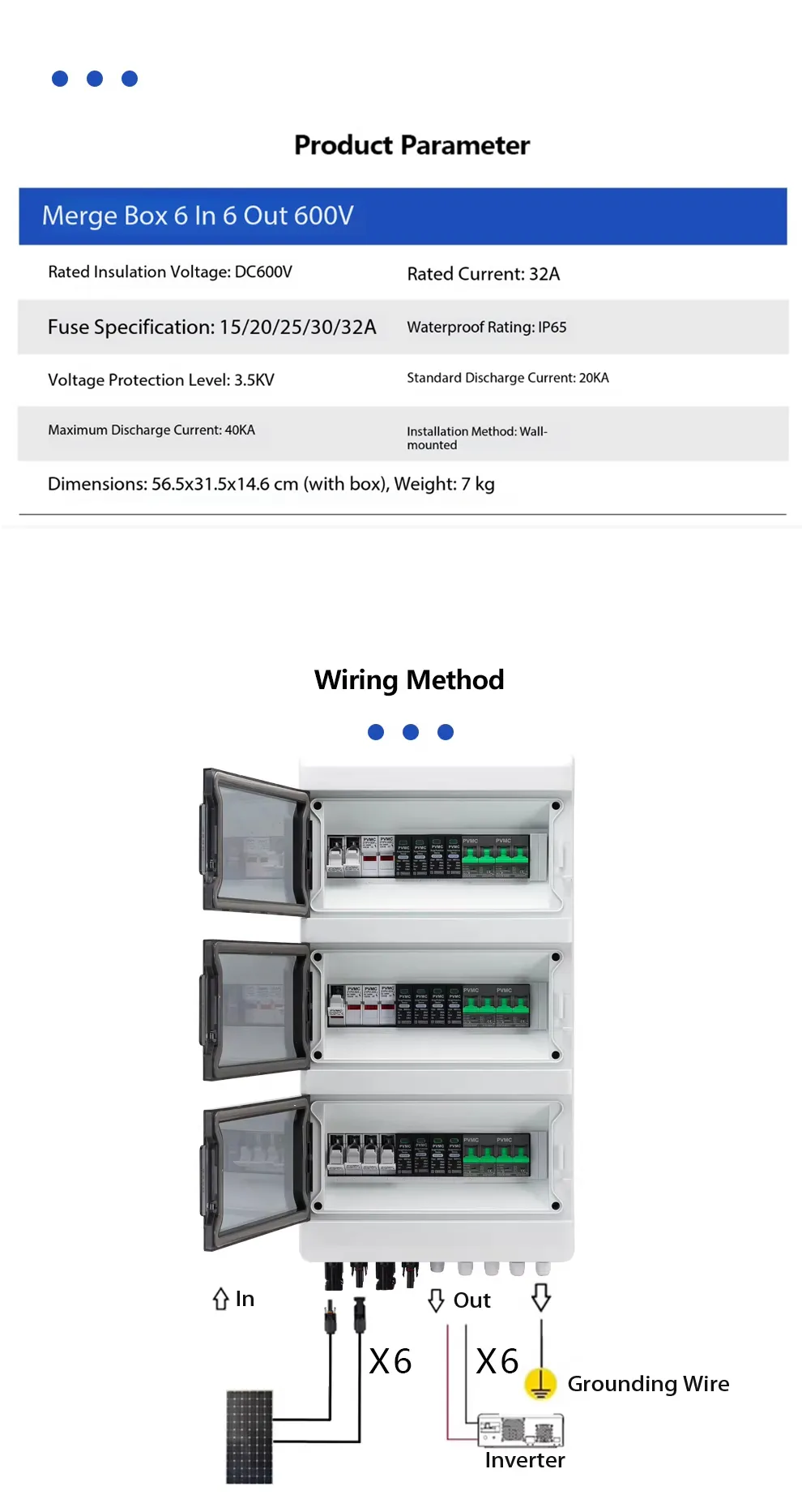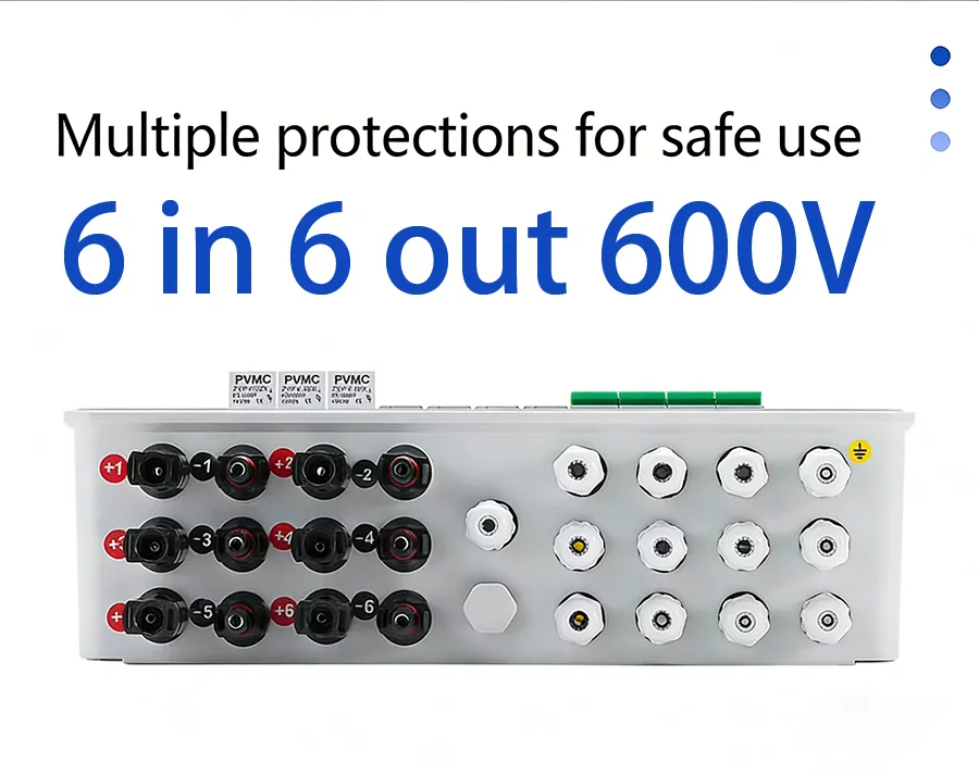 The AT Series 6 String 600V Solar PV Combiner Box is engineered to safely aggregate multiple PV strings in 600V solar systems. With an IP65-rated enclosure, six 2P 600V surge protection devices, six 2P 600V/63A DC breakers, and twelve 600V DC fuses, this combiner box ensures reliable performance and long-term durability for commercial and industrial solar installations.