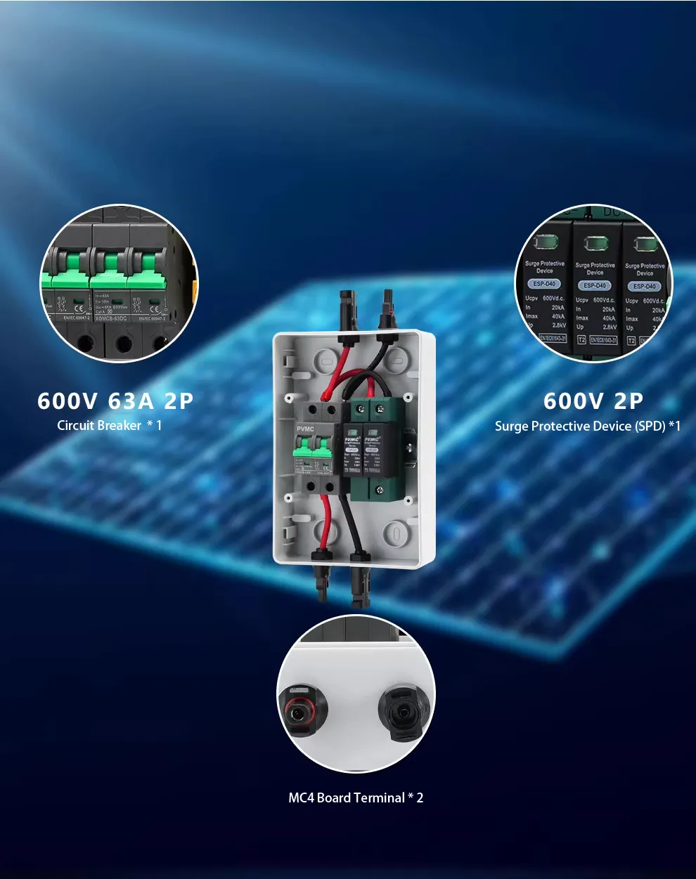 Integrated Surge Protection Device (SPD) – 2P 600V SPD guards against lightning and voltage surges