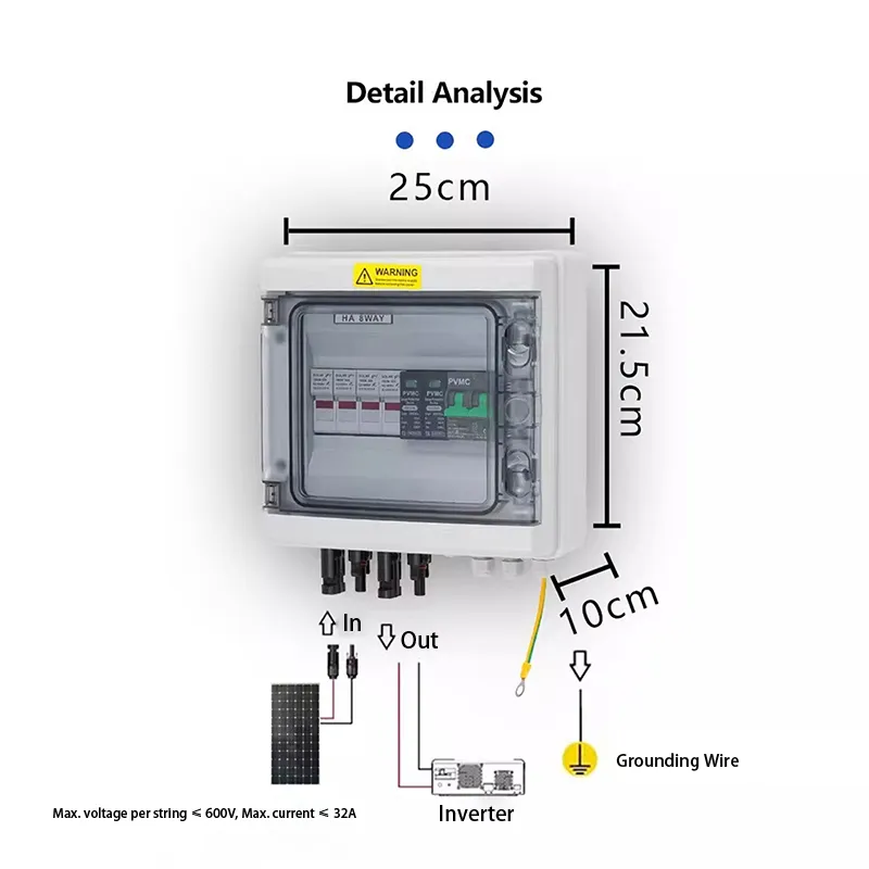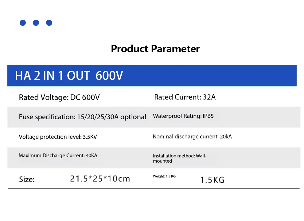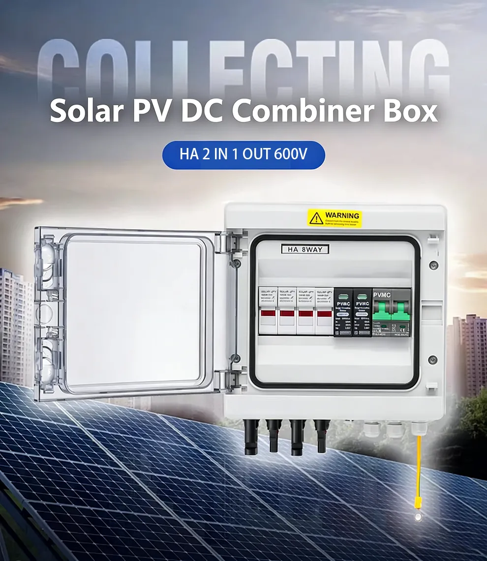 The HA Series 2 String 600V Solar PV Combiner Box is designed to safely combine two PV strings in 600V solar systems. It features an IP65-rated waterproof enclosure, a built-in 2P 600V surge protection device (SPD), a 2P 600V DC breaker, and four 600V DC fuses (one per input), providing comprehensive protection against overcurrent, short circuits, and lightning surges.