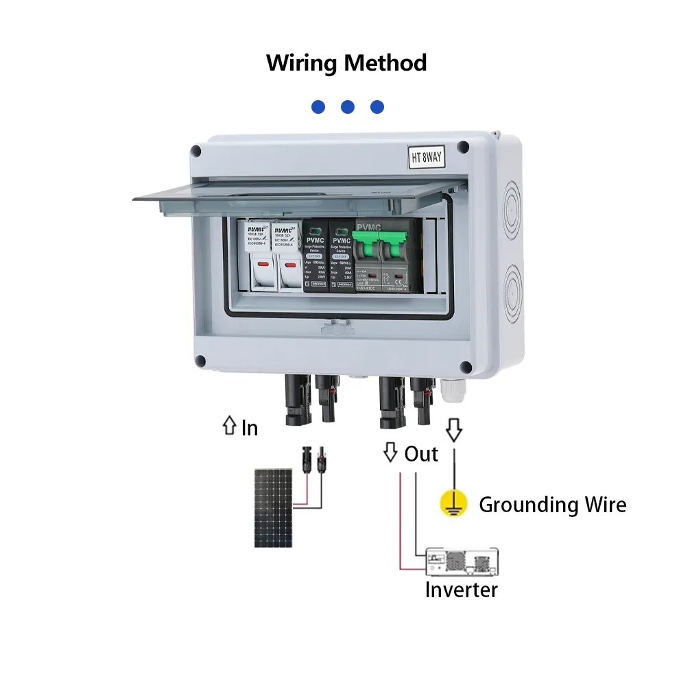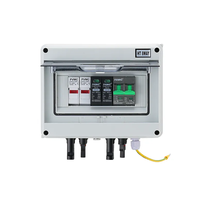 The HT Series 1 String 600V Solar PV Combiner Box is designed to safely combine a single PV string in 600V solar systems. It features an IP65-rated waterproof enclosure, a built-in 2P 600V surge protection device (SPD), a 2P 600V/63A DC breaker, and two 600V DC fuses, providing comprehensive protection against overcurrent, short circuits, and lightning surges.